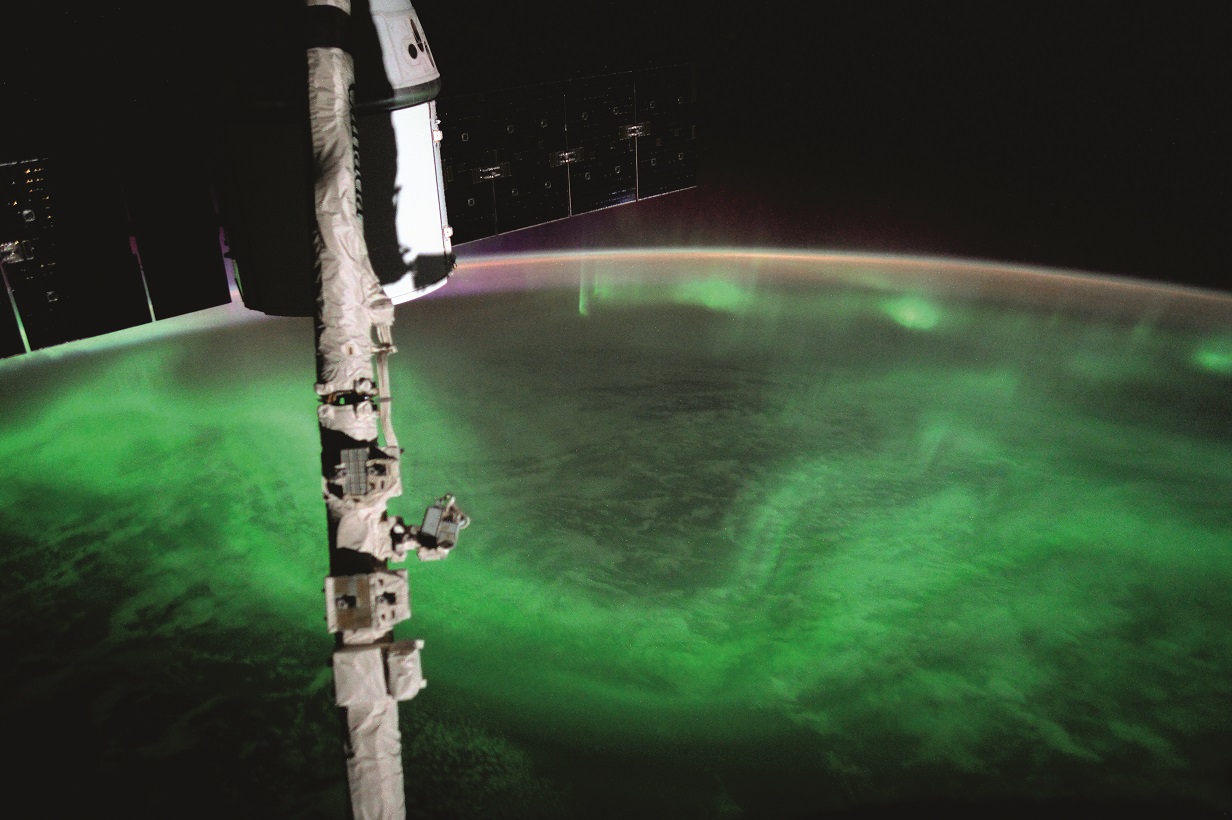 "Cheguei perto da janela ontem à noite e vi esta incrível aurora austral". Foto tirada em 17 de abril de 2016, enquanto a Estação Espacial estava sobre o sul do oceano Índico.