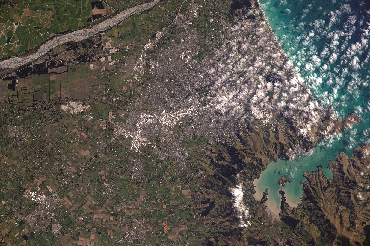 "Christchurch fica na costa leste da ilha sul da Nova Zelândia. Sempre que passava sobre ela, eu não conseguia deixar de admirar a paisagem rica e variada do país, que se altera de ambientes urbanos para montanhas e então para águas cristalinas em questão de poucos quilômetros". Foto tirada em 31 de janeiro de 2016, enquanto a Estação Espacial estava a Nova Zelândia.